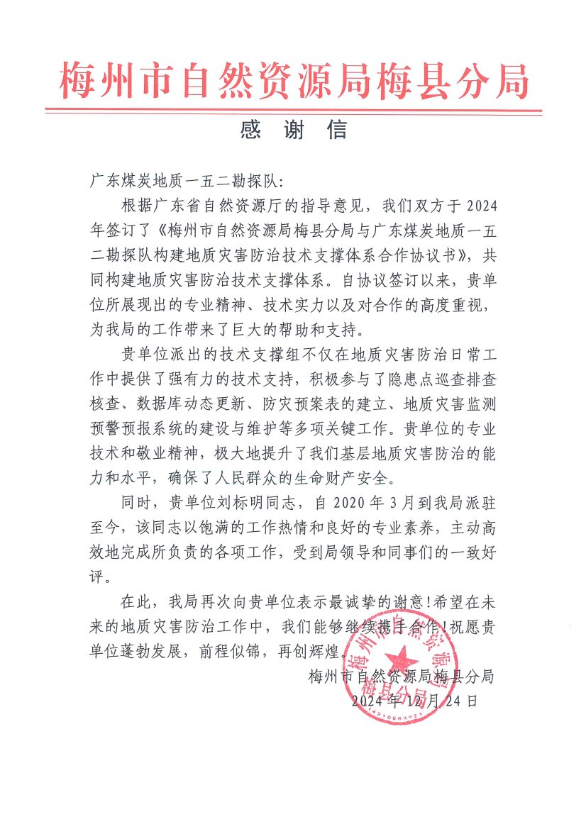 近日,一五二隊(duì)收到梅州市自然資源局梅縣分局發(fā)來(lái)的感謝信,感謝一五二隊(duì)在當(dāng)?shù)氐刭|(zhì)災(zāi)害防治工作中強(qiáng)有力的技術(shù)支持和保障。
