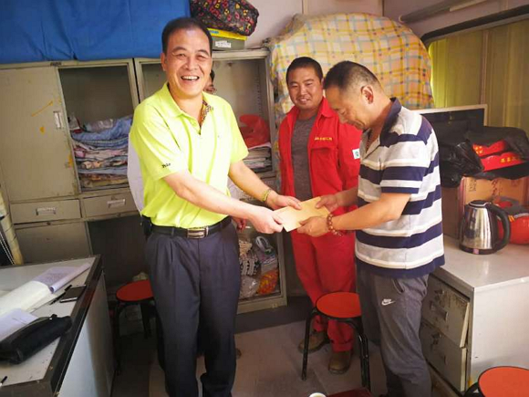 陳家慶一行進(jìn)入現(xiàn)場了解施工情況,詢問工程進(jìn)展和存在的困難,并分別就各個項目的實際情況和存在的問題,提出了解決辦法和應(yīng)對措施。在中秋、國慶雙節(jié)來臨之際,9月21日至23日,二O一隊隊長、黨委副書記陳家慶,副隊長李福生一行,分別來到二O一隊新疆庫拜煤田拜城縣煤層氣開發(fā)利用先導(dǎo)性試驗項目鉆井工程項目部、新疆準(zhǔn)南煤田烏魯木齊烏東礦區(qū)北部煤層氣資源預(yù)探項目部,慰問一線職工,為一線職工帶去了慰問金、節(jié)日禮品和節(jié)日問候。陳家慶還同項目職工進(jìn)行了座談,了解職工工作、生活狀況。