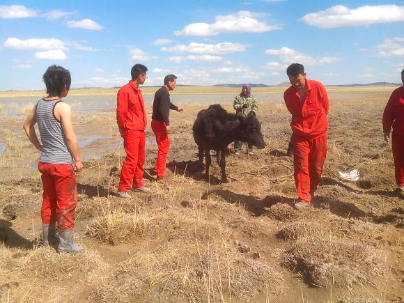 2013年6月1日下午三時許,牧民木仁突然接到電話,得知附近牧民的一只待孕奶牛陷入施工現(xiàn)場附近大概三公里的湖泊泥潭,項目經(jīng)理吳銳偉及副經(jīng)理許信忠獲悉情況后,考慮到房東木仁年紀已大,立即安排項目部人員及井隊人員即刻趕赴現(xiàn)場營救。項目經(jīng)理吳銳偉代表項目人員謝絕了牧民的好意,并向牧民表達了項目部人員對于牧民生活的關(guān)心及保障牧民生命財產(chǎn)安全的決心。營救人員及時調(diào)整部署,在后蹄脫離泥潭的時候,安排四人用繩子固定住后蹄,其余人員傾盡全力將前蹄拉出泥潭。聽到搶救奶牛的命令,剛下了班的項目部人員,穿著短袖衣來不及穿上工作服立即出發(fā),牧區(qū)處于低洼地帶,草場生長的植被多為固土的雜草,內(nèi)蒙春晚夏遲,新生草還未完全成
