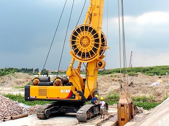 意大利土力公司的R-825型旋挖鉆機(jī),R是動(dòng)力頭,8是主機(jī)重量等級(jí),工作重量85噸;25-動(dòng)力鉆頭最大扭矩為250千牛米。鉆進(jìn)能力:在干式或配泥漿施工中孔徑2.5米、孔深77米。主要技術(shù)參數(shù):底盤配D7F底盤;履帶寬900mm;車體寬(履帶外緣距)3400-4600mm;最大牽引力715千牛;額定功率273千瓦(2000轉(zhuǎn)/分);最大功率300千瓦(2100轉(zhuǎn)/分)。