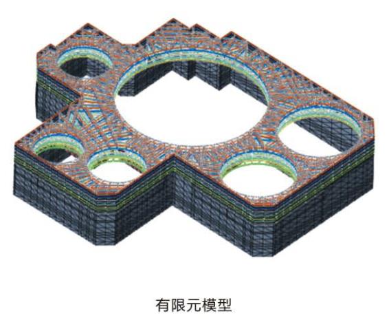 昆明恒隆廣場位于原昆明市政府舊址之上,與金格中心相鄰,基坑北側(cè)和西北側(cè)緊臨在建地鐵,周邊條件復(fù)雜,基坑深21.0~27米,基坑支護(hù)周長約1065米。本項(xiàng)目采用大型角撐、對撐及環(huán)形支撐方案設(shè)計(jì),井進(jìn)行了三維有限元整體分析。