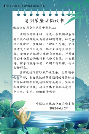 又是一年春草綠,又到一歲清明時(shí)。清明節(jié)將至,佛山分公司黨支部高度重視節(jié)日期間的黨風(fēng)廉政建設(shè)與廉潔自律工作,為認(rèn)真貫徹落實(shí)中央八項(xiàng)規(guī)定及其實(shí)施細(xì)則精神和集團(tuán)公司(局)紀(jì)委廉潔工作要求,采取早部署、早提醒等措施,加強(qiáng)節(jié)前“廉宣教”,強(qiáng)化教育宣傳,早打“預(yù)防針”,切實(shí)有效預(yù)防和遏制“節(jié)日病”,營(yíng)造風(fēng)清氣正的節(jié)日氛圍。